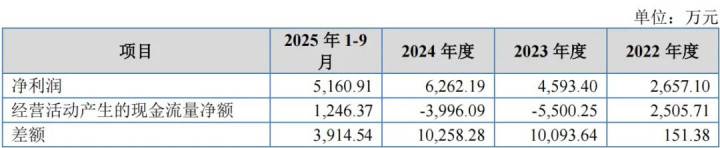 报告期各期,公司净利润与经营活动产生的现金流量净额的差额分别为151.38万元、10,093.64万元、10,258.28万元和3,914.54万元,2022年度净利润与经营活动产生的现金流量净额差异较小,2023年度、2024年度和2025年1-9月二者差异较大,存在一定不匹配情况,主要是由于存货、经营性应收项目和经营性应付项目的变动较大引起。