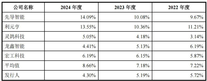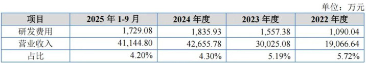 2022年至2024年,发行人研发费用金额分别为1,090.04万元、1,557.38万元和 1,835.93万元,占营业收入的比例分别为5.72%、5.19%和 4.3%;同期,发行人同行业可比公司平均研发费用率分别为7.22%、7.18%和8.66%,发行人研发费用率低于同行业可比公司平均水平。