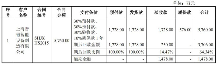 截至2025年8月31日,客户上海晋瑄智能设备制造有限公司该订单的逾期金额及期后回款情况如下: