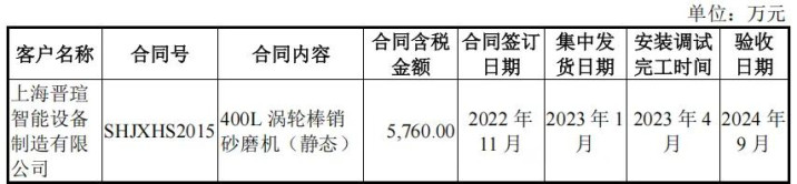 发行人与上海晋瑄智能设备制造有限公司签订的SHJXHS2015砂磨机单机订单,具体情况如下: